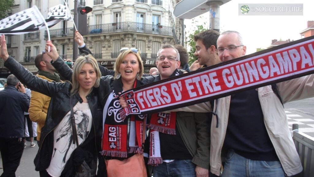 2014年5月3日のスタッド·ド·フランス。番狂わせこそカップ戦の醍醐味とはいえ、まさかサン=ドニでのファイナルでブルターニュ勢が対戦するとは。実はこの顔合わせ、五年前にも実現しており遺恨が再燃。赤と黒の同じチームカラーで仏聖地のスタンドが埋め尽くされる。八万人もの大観衆の大半はブルターニュ半島から貸し切りバスでやって来たファン·サポーターであることは間違いないない。この当時場内はアルコールNGのためスタジアム周辺は宴会状態。最初の写真は、今宵スタッドレンヌと雌雄を決するEAギャンガンのサポ-タ-。1984-85シーズンのレンヌとの試合では、仮設スタンドが崩壊して三十人の負傷者を出してしまったことからスタッド·ムニシパル·ドゥ·ルドゥルは大幅なスタジアム増築に着手した歴史も。試合前からお祭りムードで盛り上がりいざ決戦のキックオフ。