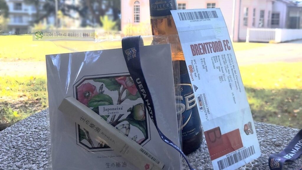最後の写真はネUEFAネーションズリーグのストラップにフラーズのESB、ブレントフォードのプレスチケットにデザインフェスタでいただいた株式会社 椿のネイル油を並べた。東京都大島町に拠点を置く同社のブランド名は『生の椿油 ジャポネイラ』。日本の固有種であるヤブツバキの種子から絞り出した油はもっとも酸化しにくい植物油。日本国内でしか採れない希少な原料からつくられた同社のオリジナル製品。