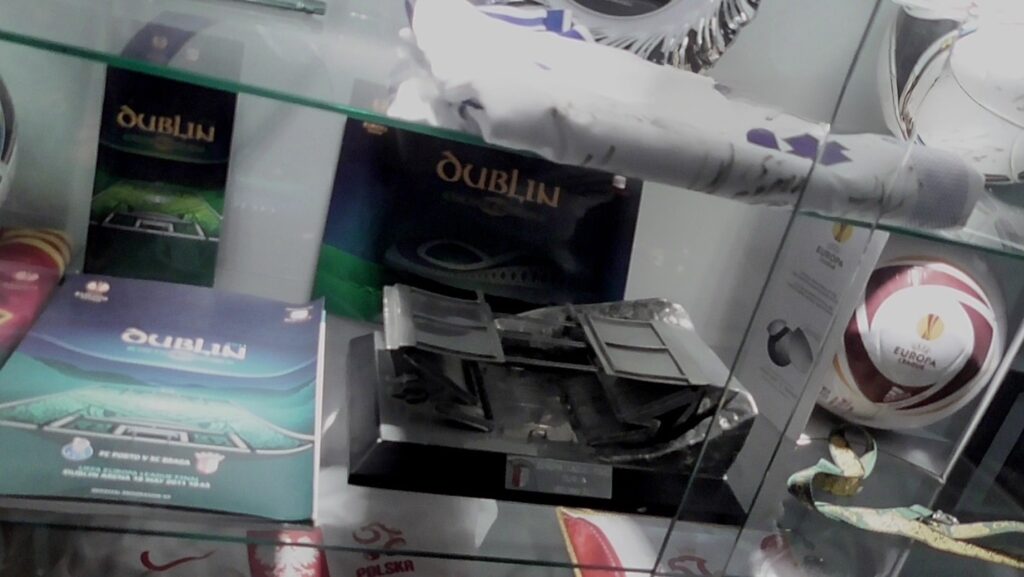 ショ-ケ-スには数々の記念品が陳列されている。白地に青の差し色はスロバキア代表のユニフォーム。銀皿には2011年9月2日と刻まれている。UEFA欧州選手権の予選で対戦。結果はスコアレスドローだった。それにしても今回のプレーオフ、スロバキアがコソボに敗れてしまうとは。同年5月18日のUEFAヨーロッパリーグ決勝の舞台とこのスタジアム。ポルトガル旋風が吹き荒れたこの大会、強豪ベンフィカを破ったブラガは史上初のファイナル進出。もうひとつの山を勝ち上がったFCポルトとの同国対決も大会史上初。ブラガのホ-ムスタジアムの通称石切り場の模型とプログラム。対戦相手に贈呈するのは知っていたが、会場にも同じものが贈られており、またスタジアムのファンショップでも購入できたりするのだが、その値段には「買う人いるなか?」と首を捻りたくなる代物。まじまじと舐めるように記念の品の数々を眺めているから地元のプレスの方は不思議に思っていたかもしれない。リアルタイムで目の前のプレーも魅力的ではあるが、筆者にとって歴史を掘り返している時が至福の時。そんなわけでこのコラムを連載している。