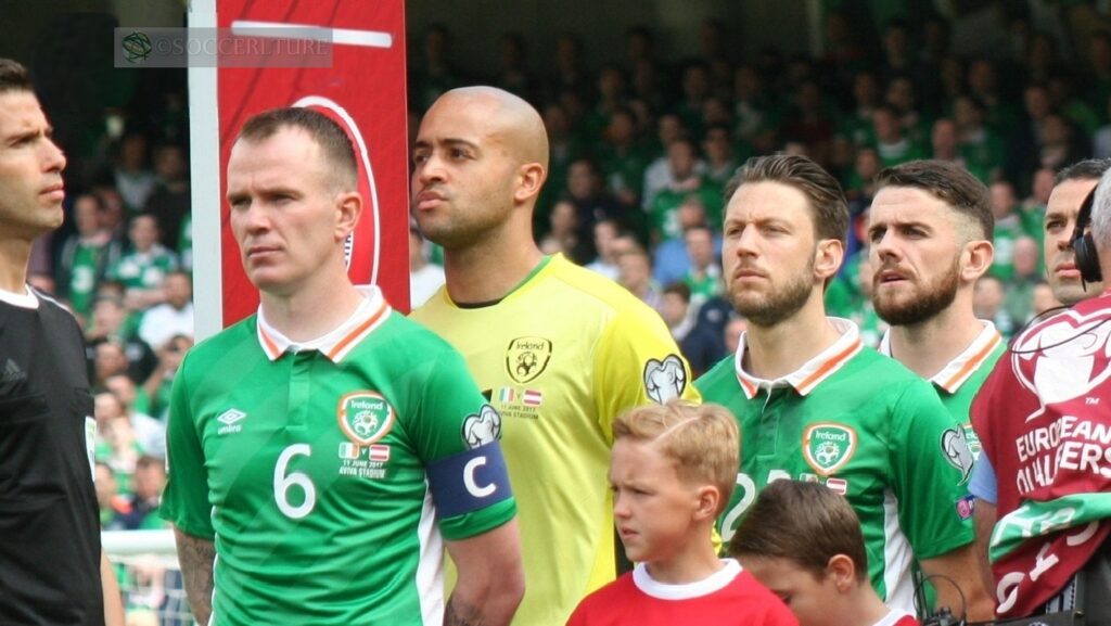 写真で主将章を巻くのはグレン·デイヴィッド·ウィーラン:Glenn David Whelan【1984年1月13日生】。ダブリン中心部からは西に約10kmほどのネイバ-フットであるクロンドーキンの出身。一昨年で現役生活にピリオド、プレミアリ-グの出場試合数276A代表のキャップ数も91を記録した。ウィーランの現役時代のスタイルを一言で表すならばポジショニングの達人。試合展開を読む状況判断力に優れ、ディシプリンを保ちタスクを達成する勤勉さとそのリーダーシップを備えた守備的ミッドフィルダ-。激しいタックルでボ-ルを奪うタイプではないが、頭の中身で勝負するタイプで玄人受けする。相手が格下ならばウィーランの存在は然程重要ではない。その真価を発揮するのはオランダのようにポゼッションで圧倒してくるチ-ムとの試合。下写真は2008年から17までプレ-したスト-クシティでの最終シ-ズン。あらためて思ったのはこのタイプの選手の重要性に気づいたのは92年の日本代表。現在の日本代表監督を率いる森保一:Hajime Moriyasu【1968年8月23日生】監督の現役時代のプレ-だった。現在ウィーラは英二部ウィガン·アスレティックのコ-チ職に就いているが、将来ナショナルチ-ムの指揮を執る日が来るのかもしれない。