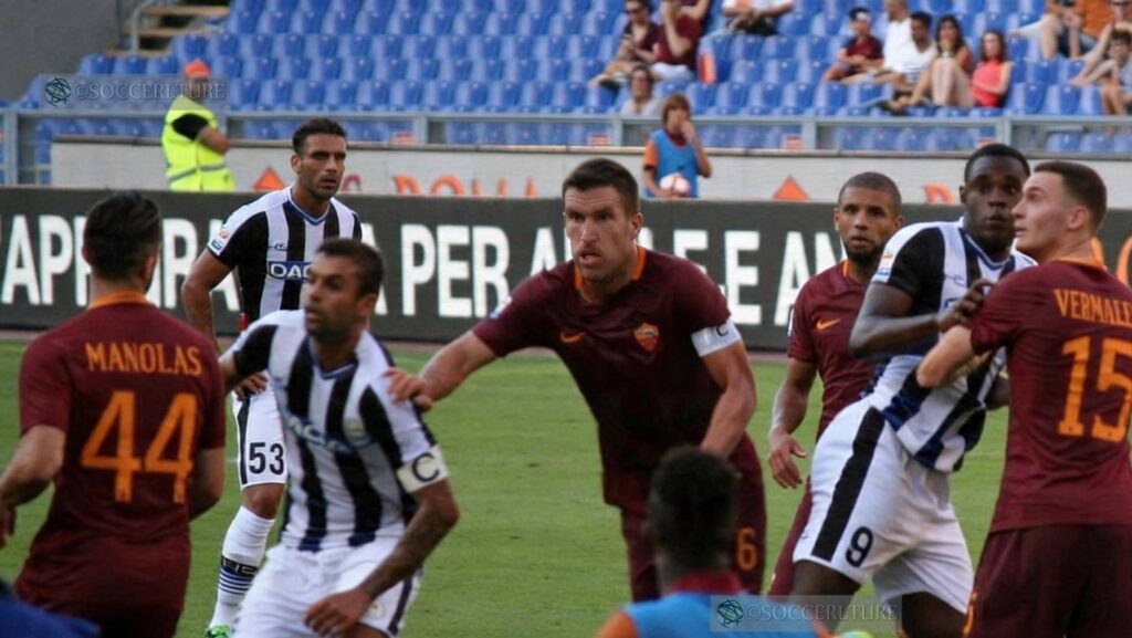 写真は2016年のセリエA開幕戦。ASロ-マの背番号六は白い主将章を巻いてのプレー。臙脂のウェアを着たストロートマンを初めてカメラに収めたのがこのウディネーゼ戦。完全復活を果たしたこの年の師走13日第16節オリンピコで二位ロ-マは三位ミランと対戦する。一点のビハインドでゴ-ルを割れずにいたミランは残り六分で最後の切り札本田をピッチに送り出しても時既に遅し。四月のローマ·デルビーに敗れ逆転優勝が遠のいたローマに追い討ちをかけたのがスポーツ裁判所の判定。相手選手に水をかけたとしてストロートマンに二試合出場停止の処分が下され大騒ぎに。 何故ならば5月7日にアウェイでの同勝ち点で二位に並ぶミランとの試合、続く首位ユヴェントス戦と寄によって天王山連戦をストロートマン抜きで戦い結果ユ-ヴェの六連覇を許している。