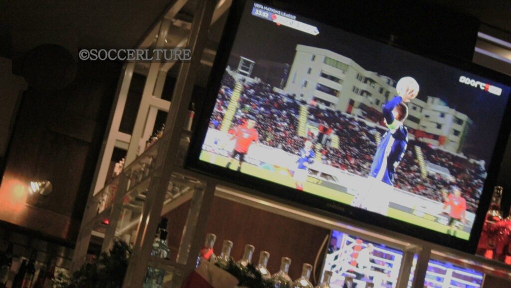 2022年のUEFAネーションズリーグ(UNL) 取材巡業。フランスは地元サン=ドニ、スペインとオランダもアウェーでのスケジュールが組めた。とはいえ強豪国全てをフレ-ムに収めるのは移動時間が足りない。カ-ディフでのウェ-ルズ対オランダ戦の前日。ドイツ対イングランドはロンドンのパブでテレビ観戦となった。ロンドンのクラフトビールのグラスを片手にミュンヘンから送られてくる映像をリラックスして眺める。確か四年前UNLも同じ事があった。あの時はブダペストで見たのはアルバニアとスコットランドの試合。敵地シュコドラでスコットラドが0-4で完勝。 この日は五十四歳の誕生日とあって通訳で同行していた女子大生がお祝いしようと連れてかれたのが結構有名な店だったはず。カウンターに腰掛けウニクムを飲んで見上げた画面が下写真。