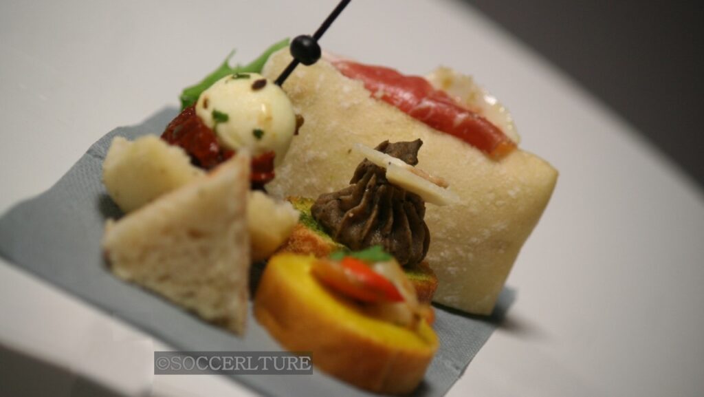 イタリアレストランでもよく目にする前菜皿のピンチョス。スペイン北部バスク地方が発祥の地。郷土料理と呼ぶにはあまりにも簡単。パンを細かく切って食材を重ね爪楊枝で差すだけ。オードブル、ワインのツマミにはぴったりハマるので、スイスやクロアチア滞在時にも注文していた。写真はオリンピック·リヨン対ユヴェントス戦を取材時、プレスホスピタリティの食事にもピンチョスが。ロヴレンも二度在籍したリヨンだったが美食の街もお気に召さなかったか。下写真はカタールギからのベルギー戦映像。クロアチア推しなので相手を飲み込むベルギービールはレフ:Leffe。