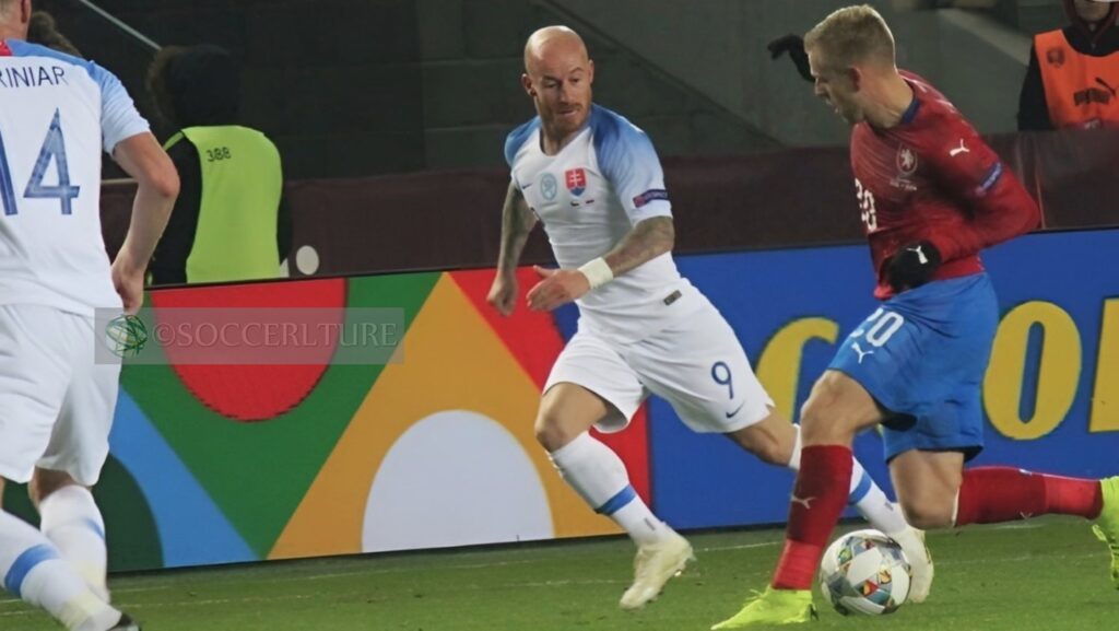 スラヴィアで気になるのは左ウィンガーのミロスラフ·ストッフ:Miroslav Stoch【1989年10月19日生】。写真は翌年プラハでのUEFAネーションズリーグ。スロバキア代表の九番は普段自身のホーム、勝手知ったるスタジアムながらこの日ばかりはアウェーのプレーヤーとしてブーイングを浴びる羽目に。’16年に在籍したトルコのフェネルバフチェでは出番に恵まれておらず新天地スラヴィアへ。前節のスパルタとのダービーではプレースキッカーを任され先制点をアシストし勝利に貢献したから要注意。
