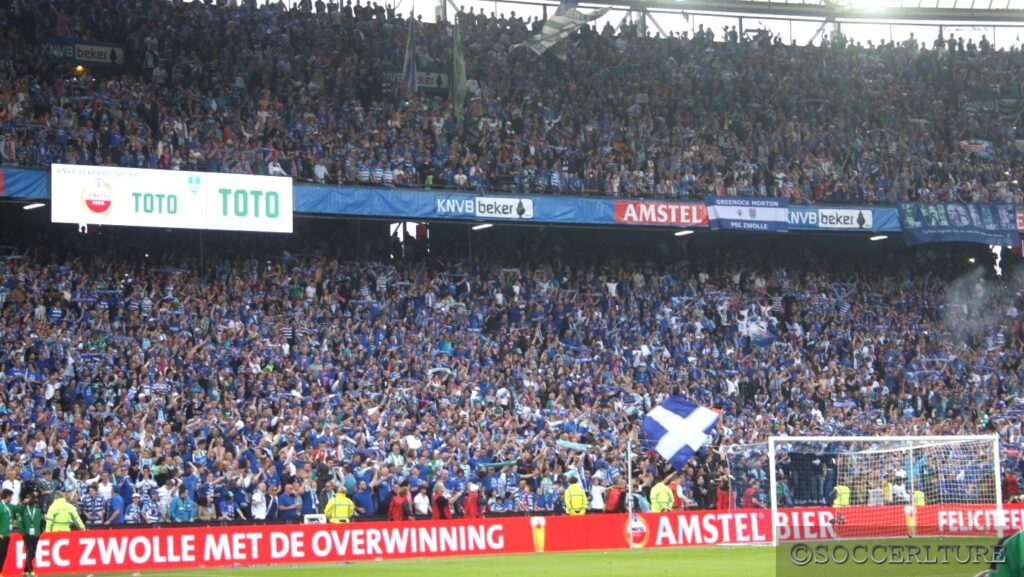 この試合は発煙筒もどきがピッチに投げ込まれ途中試合が中断。アヤックスが先制して良い流れだったのだが信じられない愚行で断ち切られたから選手達が気の毒。マーケティング·ダイレクターのエドウィン·ファンデルサール:Edwin van der Sar【1970年10月29日生】がマイクを握って混乱を沈めた。その後アヤックスの歴史上稀に見る無残な展開。四十二分間で五失点の屈辱を味わったケネス·フェルメール:Kenneth Vermeer【1986年1月10日生】は現在PECズヴォレ所属。控えキーパーで出番のないまま三十九歳の誕生日を年明けに迎えた。それにしても今写真を見直してもズヴォレサポーターで膨れ上がったスタンドに驚く。ズヴォレ市の人口は十二万人以上。オーファーアイセル州の州都はオランダでは中規模都市の部類。少なくともド田舎ではないことを二十七年の歳月を経て知ることとなった。
