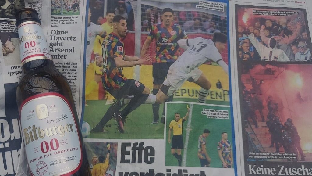 過去には岡崎慎司:Shinji Okazaki【1986年4月16日生】が加入した2013年当時はフランスの金融保険会社コファス、武藤嘉紀:Yoshinori Muto【1992年7月15日生】在籍時は自動車メーカーのオペルがネーミングライツ契約。’21年からはテキスタイルマネジメント企業MEWAの名を冠するアレーナ。上写真はビットブルガー·ドライブの瓶と2月24日のビルト紙面。前々日のマインツ対ザンクトパウリ戦。着用したのはカラフルなデザインはカーニバル·モデル。