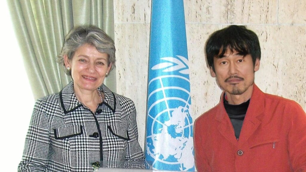 プレスカンファレンスル-ムには、椅子と小さな机が個別にセットされており非常に珍しい光景。欧州の大半は椅子を並べただけ。小学校の教室を思い出させる。授業が終われば椅子を机の上にのせて清掃してから下校。先々月の八日、ドイツの週刊誌デア·シュピーゲルによるとシュヴェービッシュ·グミュントが生徒が教室を掃除を日本式を導入。チームワークが高まる効果を期待していると市長はコメントしている。日本のファンサポーターによる国際大会でのゴミ拾いは風物詩。日本代表選手のWC敗退後にロッカール-ムを清掃したことも話題となる。始まりは日本が悲願の初出場を遂げた’98年フランス大会。この時パリに本部を置くユネスコから表彰の申し出に対して辞退をしている。ちなにこのユネスコ·パリ本部、旅券を所持していれば誰でも入れるのでこんな写真を職員に撮ってもらった。パリ土産にグッズを購入したくて、度々訪問。レストランで食事をしていたらイリナ·ボコヴァ:Irina Bokova【1952年7月12日生】事務局長が通ったので記念のツ-ショット。小柄な女性を想像していたが、こうして見るとそうでもない。というか自分の背が低いだけか。