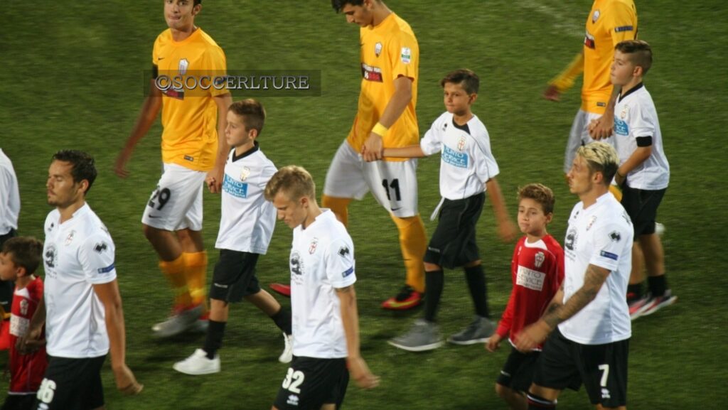 一方アスコリではバユシの右斜め後ろ(写真では右斜め上)を歩く十一番。当時十九歳の若武者が俯いている。現在ボローニャとアズーリで背番号七を背負うリッカルド·オッソリ-ニ:Riccardo Orsolini【1997年1月24日生】。この年三月にプロデビューしており、この試合から四ヵ月後にはユヴェントスに買われてマルケ州を去った。