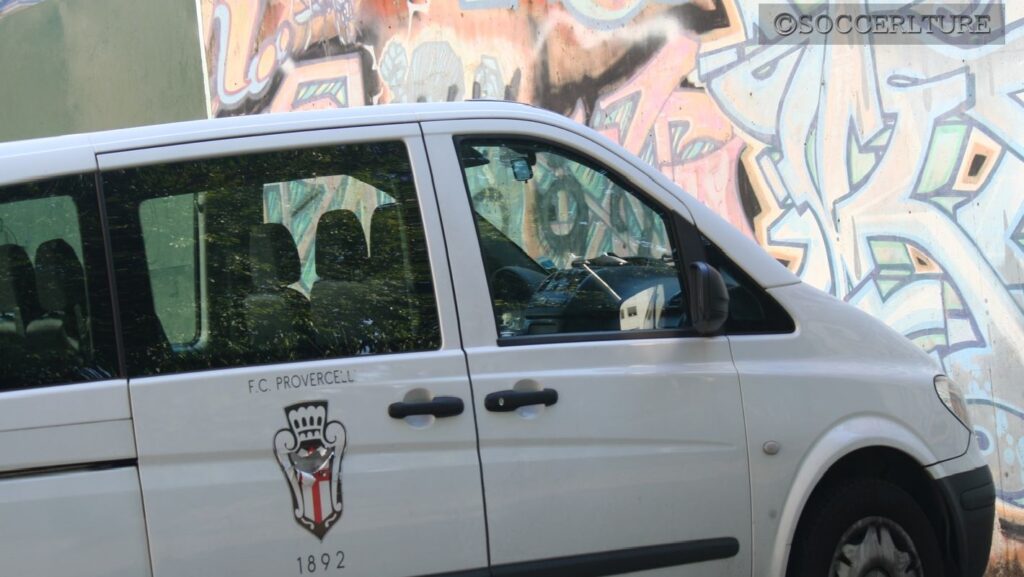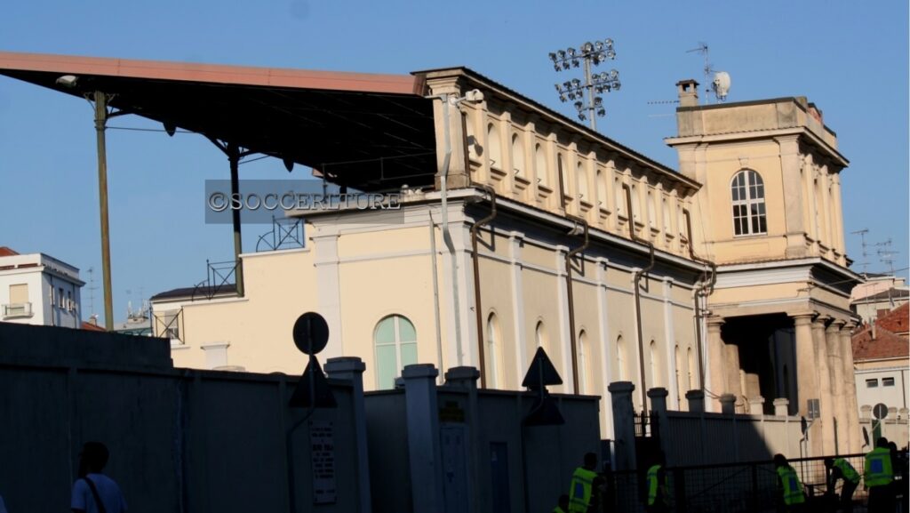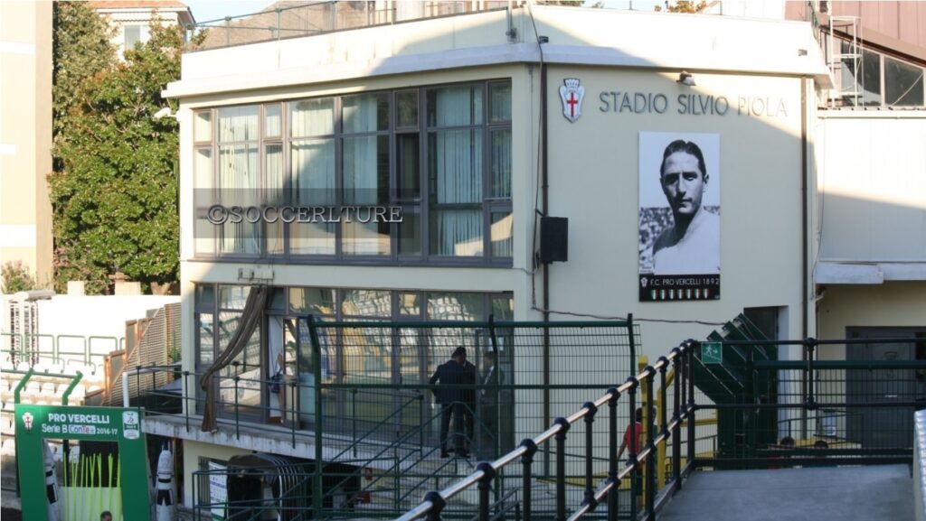 メインと東スタンドの間には後からこさえた近代的な建物がある。更衣室やプレスルーム、VIP用の特別ルームを備えており外壁にシルヴィオ·ピオラS:ilvio Piola【1913年9月29日生】の巨大な写真が飾られている。ロンバルディア州のロッビオで生まれヴェルチェッリで育った。母方の叔父は、イタリア代表ゴールキーパーのジュゼッペ·カバンナ:Giuseppe Cavanna【1905年9月18日生-1976年11月3日没】。彼もまたこのクラブの歴史に名を残した偉大なレジェンド。対面の北側スタンドは前(15)年の改修工事で拡張、四つのスタンドを併せると合計五千五百名の収容となる。北側のゲート壁面に描かれたグラフティ。公用車のエンブレムが剥げているのもご愛敬。
